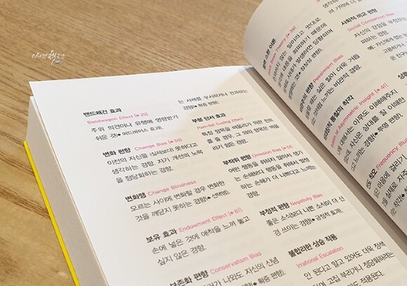 이 책에서 다루는 주제가 바로 편향 중 하나인 '인지 편향'이다. '인지 편향'(Cognitive bias)은 우리 뇌가 효율적으로 작동하려고 최적화를 진행하는 과정에서 생겨난 결함이다. 이런 편향을 다룬 책들은 많이 있었다. 앞에 이야기한 '행동경제학'을 다른 '행동경제학', '상식 밖의 경제학'이라는 책도 있다. 사실 유명한 논문을 같이 다룬 부분도 있어, 몇몇 챕터는 중복되기도 한다. 하지만 이 책은 편향의 고전부터 최신 예시까지 80개 항목을 선정했다. 재미를 위해 삽화와 퀴즈로 시작하고, 그에 대한 설명으로 이루어져 있다. 지금까지 본 편향 관련 책 중 가장 쉽고, 깔끔한 책인 것 같다.