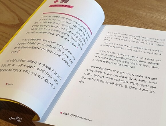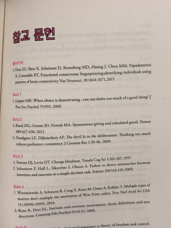 이 책의 저자의 이전 작품 <본인은 깨닫지 못하는, 마음의 맹점>이 호평을 받아 내용을 보충하고, 30항목에서 전체 80항목으로 늘렸다고 했다. 금방 읽을 수 있는 책이지만, 출처와 조사를 5년간 했다고 하니 검증되지 않은 글을 바탕으로 쓰인 일부 인터넷 게시물과는 다르다. 다만 80개의 항목을 다루다 보니, 깊이 조금 얕아 보일 수 있지만, 이 책은 어찌 보면 '인지 편향'에 대한 샘플러 같다는 생각이 든다. 어떤 부분에 더 알아보고 싶은 마음이 들면, 더 깊이 들어갈 수 있도록 논문을 전부 출처 표기하였기 때문에, 이를 읽거나 인용된 논문을 찾아보는 재미를 이어갈 수 있다.