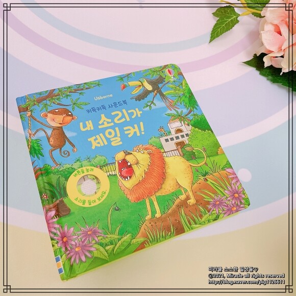 #동물원 의 동물들이 소리를 뽐대듯 서로서로 자기의 소리가 제일 크다며 사자는 으르렁, 돌고래는 끼리릭 끼리릭, 원수이는 끼익끼익, 고릴라는 쿠르렁 하며 다양한 소리가 담겨 있는데요.