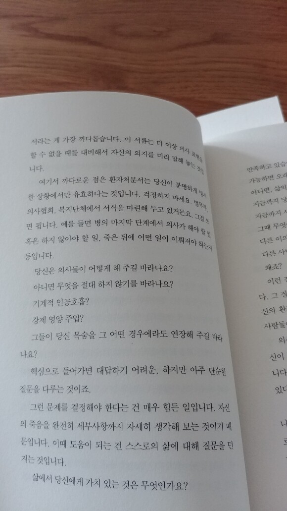 이 책 [죽음의 에티켓]의 문장은 서정적이다. 죽음이 갑자기 닥치고 해치워야 할 과제로 여기는 것이 아니라 조금씩, 준비해야 할 것임을 나타내듯이 이런 문체를 사용하는 것 같다. 죽음을 준비한다는 것은 현실에 대한 도피가 아니라 현실을 더 사랑하는 행위일 수도 있겠다라는 생각을 이 책을 준비하면서 하게 된다. 갑작스런 죽음으로 남겨진 사람들에게 전해야할 메시지나 진실을 건내지 못하고, 또 자신이 원하는 장례방식을 선택하지 못하고 죽어가는 사람이 부지기수인 현실에서, 자신이 원하는 삶을 죽음으로 이어지게 하는 것 또한 상당히 중요한 것임을 깨닫게 된다.
