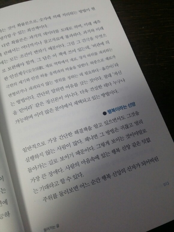 해서 저자는 그런 논리로 ‘비관하는 힘’을 추출해내는 것이다. <인간이 다른 동물보다 뛰어난 이유는 ‘이렇게 해도 꼭 그렇게 된다고는 할 수 없다’라는 사고방식 때문인데, 이를 ‘예측에 대한 비관이라 한다.>(10쪽)