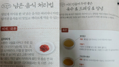 책은 첫장부터 나의 관심을 확 끌었다. ㅎ 첫번째로 나온 남은 음식 처리법. 음식을 먹고 난 후 조금씩 남게 되는 음식들을 더 맛있게 색다르게 먹을수 있는 아이디어를 제공한 페이지로 예를 들어 북엇국이 남으면 달걀과 섞어 한컵을 만들어 중탕으로 쪄내면 별다른 재료, 양념없이도 촉촉한 달걀찜을 만들수 있다는것 !!!