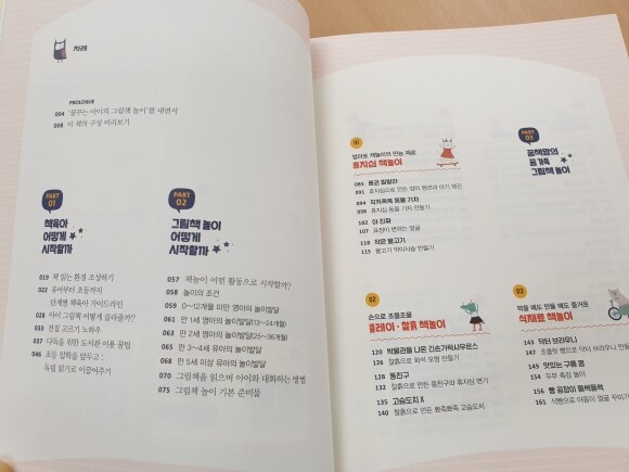이 책은 말 그대로 0세부터 10세까지 책육아&책놀이 로드맵입니다. 저자가 10년간 도서관에서 긴 시간을 보내며 직접 찾은 그림책과 책놀이가 실려있어요. 저처럼 시간이 부족한 직장맘들에겐 정말 편하게 따라할 수 있는 보물지도같아요~ 그림책 114권과 창의력이 폭발하는 책놀이 38권이 소개되어있어요 일주일에 한권씩만 따라해도 9개월은 행복한 책놀이가 마련되었어요. 책도 일반사이즈보다 커서 큼직하고 눈도 안피로하네요. 맨 처음 책구성부터 보자면 ① 유아부터 초등까지 단계별 책육아 가이드라인 ② 아이가 재밌게 볼 수 있는 그림책 고르는 방법 ③ 전집 고르기 노하우 ④ 다독을 위한 도서관 이용 꿀팁 ⑤ 초등 입학을 앞두고 : 독립 읽기로 이끌어주기 ⑥ 책놀이, 어떤 활동으로 시작할까 ⑦ 그림책을 읽으며 아이와 대화하는 방법 ⑧ 그림책 놀이 기본 준비물 ⑨ 꿈책맘의 꿈 가득 그림책 114권과 책놀이 38가지 ⑩ 큐레이팅한 그림책의 매력 및 100배 활용법 ⑪ 함께 읽으면 좋을 그림책과 작가의 또 다른 그림책 ⑫ 책육아를 하면서 부딪히는 여러 가지 고민 Q&A ⑬ 꿈꾸는 아이를 위한 그림책 및 책놀이 목록