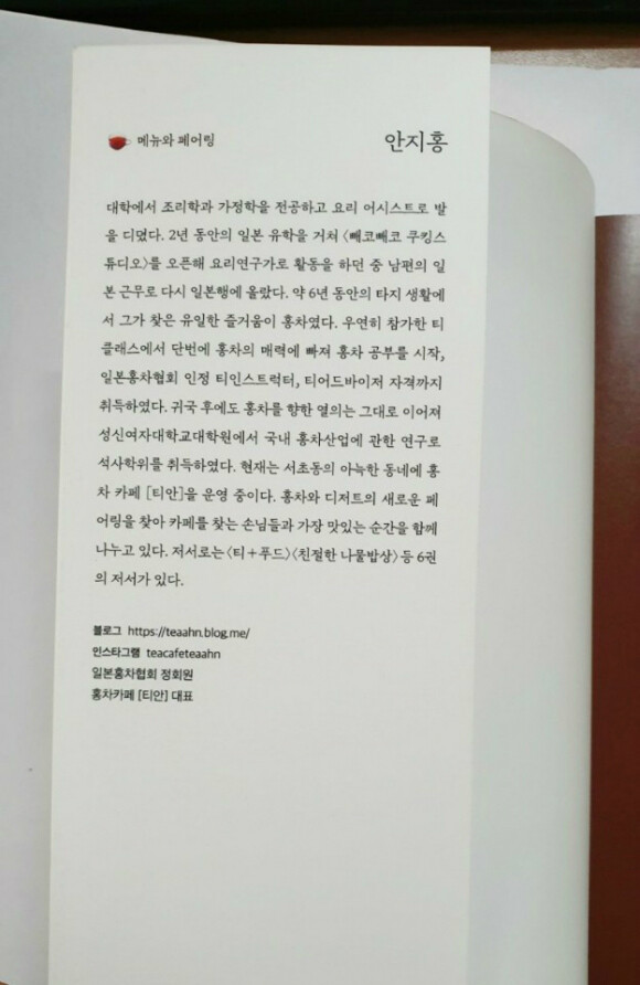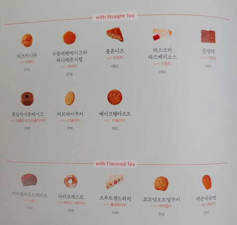 다양한 차와 디저트를 서로의 맛을 높여주는 궁합을 찾아 준다. ![]() ![]() 차의 대표적인 맛이 쓴맛이라면 디저트로 선호하는 맛은 단맛. 커피의 쓴맛과 홍차의 쌉싸름 함이 디저트의 닷맛을 돋보이게 하면서 그 맛을 중화시켜준다. 에스프레소와 어울리는 브라우니, 버터쿠키, 허니브레드, 생초콜릿, 솔티 플레인스콘 아메리카노와 어울리는 갈레트, 아메리칸쿠키, 초코스콘, 라즈베리컵케이크, 그릴드치즈샌드 라떼와 어울리는 말차화이트초코파운드케이크, 바게트 트리플 치즈피자, 비스코티, 팬케이크, 잼샌드쿠키 달콤한 라떼와 어울리는 티라미스컵, 치즈크래커, 빵푸딩, 민트 아보카도 그린 샌드위치, 마스카포네 크림 블루베리 타르트 아쌈티-치즈미니슈, 우바티-수플레팬케이크와 허니레몬시럽, 아쌈티와 블론디즈, 기문티와 러스크와 라즈베리소스, 기문티와 플랩잭 다즐링 퍼스트 플러쉬티와 흑임자 시폰 케이크 다즐링티와 리브 파이 쿠키 다즐링티와 베이크웰 타르트 애플티와 캐러멜 파운드 케이크, 레이디그레이티와 파리브레스트, 플라워리티와 프루트 샌드위치 캐러멜티와 코코넛 오트밀 쿠키, 얼그레이티와 레몬 마들렌 등... 커피 디저트 페어링 / 커피 메뉴 레시피 / 커피 디저트 사이드 메뉴 홍차 디저트 페어링 / 홍차 메뉴 레시피 / 홍차 디저트 사이드 메뉴 녹차 디저트 페어링 / 녹차 메뉴 레시피 / 녹차 디저트 사이드메뉴 허브티& 베버리지 디저트 페어링 / 허브티&베버리지 메뉴 레시피 허브티 디저트 사이드 메뉴 / 베버리지 디저트 사이드 메뉴 53가지 음료 메뉴 + 86가지 디저트 메뉴 페어링 책을 받기전 설마 레시피가 다 있겠어 ? 했는데 놀랍게도 이 많은 내용이 이 책 한권에 꽉꽉 알차게 들어있다.