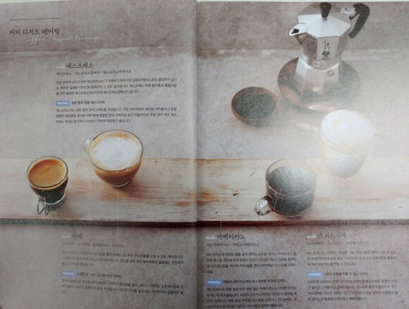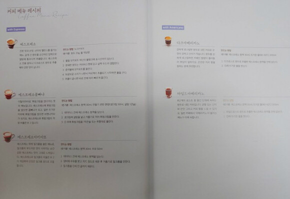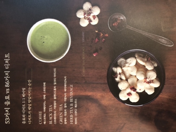 기본적인 커피,, 홍차,, 녹차,,, 쥬스, 스무디, 허브차 등등 다양하게... 또 1:1로 어울리는 디저트 레시피까지~~