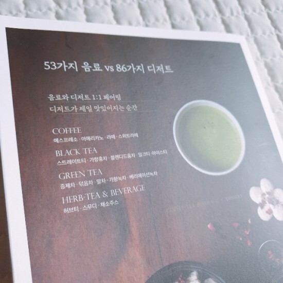 목차는 커피 디저트 블랙티 디저트 그린티 디저트 허브티, 베버리지 디저트로 나눠 구성이 되어 있어요