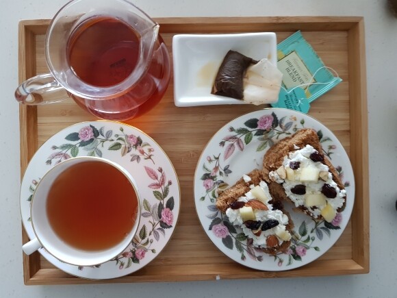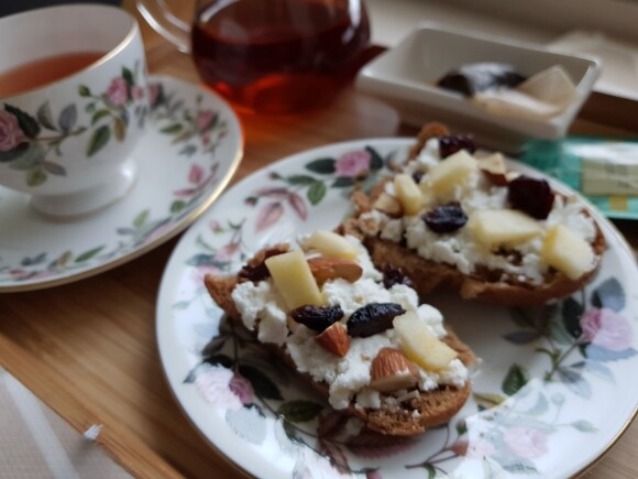 프루트샌드위치와 플라워리티 꽃향이나 꽃잎을 첨가한 가향홍차 과일과 꽃 기대되는 페어링이예요