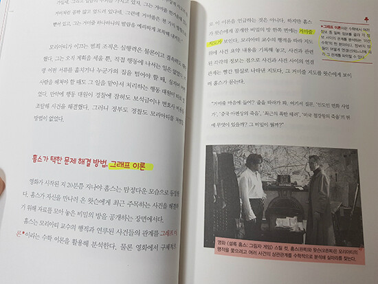 나도 추리 소설을 좋아한다. 역시나 추리 하면 셜록 홈즈이다. 그리고 그의 친구이자 조수인 왓슨! 범인을 쫓고 쫓으면서 생각을 하고 또 하며 추리를 하고 과학적, 수학적 지식을 이용해 문제를 하나하나 해결하며 실마리를 풀어나간다. 영화의 내용도 간략히 소개하면서 홈스와 대결하는 수학자와의 긴장감 넘치는 이야기와 함께 영화속에 숨어 있는 그래프 이론이 소개되어 있다.