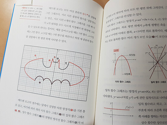 손가락으로 안경을 만들어 거꾸로 얼굴에 갖다 대며 "배트맨!!!"하고 외치며 놀았던 기억이 난다. 배트맨의 상징인 박쥐모양의 로고!!! 다양한 물건에서도 배트맨 로고를 종종 볼 수 있었는데 이 모양에도 수학이 숨어 있었다니... 그림 하나에도 수학 공식으로 정확히 대칭이 되며 타원방정식을 기본으로 이차 함수 그래프, 일차 함수 그래프, 상수함수 그래프가 다 들어 가 있다니.. 어질어질하다.... ^^: