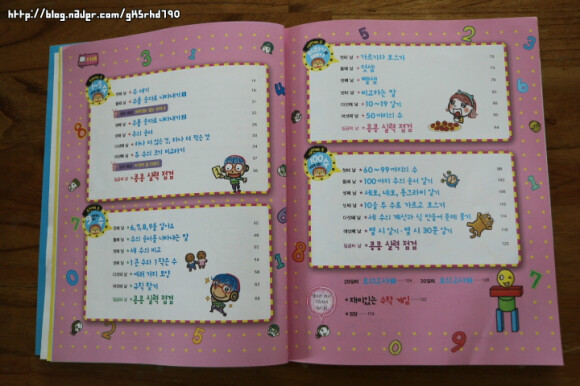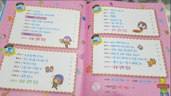 ![]() 총4단원 각 단원에는 여섯째 날까지 구성 일곱째 날에는 실력 점검시간이에요 첫번째 주 : 1~5 까지의 수 두번째 주 : 9 까지의 수 세번째 주 : 더하기와 빼기 네번째 주 : 100까지의 수 6일 X 4주 = 24일 동안 각 단원에서 수학 교과 과정을 만화형식을 빌려 스토리텔링으로 정말 재미있게 풀어준답니다 각 단원은 매일매일 전혀 부담스럽지 않는 15분의 기적~~ 그리고 마지막 2틀은 모의고사를 풀면서 최종 점검 이렇게 딱 30일 완성 과정이지요