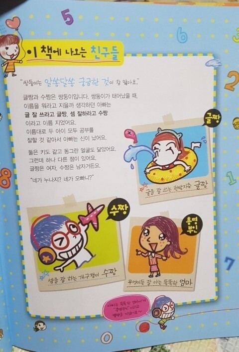 글을 잘 쓰는 천방지축 글짱 셈을 잘 하는 개구쟁이 수짱 무엇이든 잘 아는 똑똑한 엄마 총명부인 알쏭달쏭 궁금한 것이 참 많은 글짱과 수짱은 쌍둥이랍니다 캐릭터들 모두 너무 귀엽고 개성이 넘치는것 같아요 수학책인데 그림책처럼 알록달록한 색감을 사용하여 아이들 시각을 먼저 자극하고 만화 형식으로 되어 있어 아이들이 흥미로워 해서 거부감 없이 시작하기 좋은 책인것 같아요