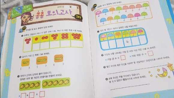 똑똑한 초등학교 입학 준비 초등학생이 되었다 수학 표지가 샤방샤방 흥미진진~ 아니 이거 그림책이야, 수학책이야? 엄마가 갸우뚱하는데, 아이가 받아들고는 넘 좋아하더라구요. 역시, 그림책이 먹힐 나이죠ㅎㅎ 책을 쭈욱 살펴 보니, 속에도 예쁜 그림이 빵빵!! 수학에 입문하는 아이들이 쉽고, 친근하게, 재미있게 공부할 수 있을 것 같아요.