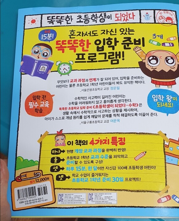 똑똑한 초등학교 입학준비 시리즈! 수학은 물론 국어,바른마음,학교생활이 있더라구요. 학교가기전 아이와 풀어보면 좋을것 같아요. 혼자서도 풀수있는 ''초등학생이 되었다 수학편!'' 재밌게 아이와 풀고 있어요. 하루15분! 매일같이 잘 따라와주어서 제가 다 즐겁네요^^
