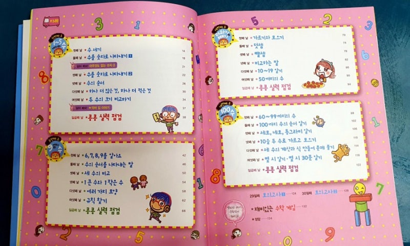 첫번째 주 : 1-5까지의 수 두번째 주 : 9까지의 수 세번째 주 : 더하기와 빼기 네번째 주 : 100까지의 수 29일째, 30일째 - 모의고사 재미있는 수학 게임 하루 15분, 30일 프로젝트!!!