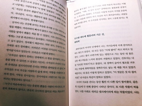 넘어져도 무너지지 않고 다시 일어나는 법 새로운 일을 시도할 때면 매번 망설인다. 이 일의 진행이 성공할 수 있을지 내가 감당할 자신이 얼마나 있는지.. 끝없는 자기 검열을 마치고도 계속 그 과정을 지치도록 반복한다. 어쩌면 '넌 이걸 감당할 수 있을 정도로 그릇이 크지 않아' 라는 포기를 이끌기 위한 도전에 대한 회피가 의식적으로 지배하도록 내버려두는 편을 선택하는 편이 속 편하다. 아무것도 하지 않으니 아무런 일이 일어나지 않고 일이 없기에 실패를 경험치 않아도 되니 괜찮다라고 스스로 현실에 안주해 도전을 외면한다. 그렇게 많은 에너지를 끌어 쓰길 겁내하고 나약함을 감추는 것에만 눈치를 본다. 깊은 내면에선 나를 더 근사한 사람으로 살기 위한 뭔가의 작은 시도가 너무도 절실해보이는데도 내버려두었던 일들이 대부분이다. 난 이제 시도하지 않는 인생으로 계속 살아가는 건가. 열정으로 가슴 뛰거나 실패를 맞설 수 있는 힘은 저 바다 넘어에 있는 것인지. 난 지금도 수영을 못한다. 물공포증이 상당히 발목을 잡는다. 발 밑에 바닥이 닿지 않으면 말할 수 없는 공포감이 엄습해온다. 온몸에 힘이 들어가 몸을 가볍게 띄우는 것이 버겁다. 물 속에 빠져서 이후에 벌어질 끔찍한 참사와 악몽이 물 속에 발을 넣고 앞으로 나아가길 시도조차 하지 못하게 한다. 이런 공포 본능이 나를 압도하기에 수영을 마스터하기란 참 멀고도 험한 길 같아 보인다. 그런데 늘 수영을 배우고 싶다. 물에 대한 공포를 극복하고 싶었고, 지독히도 무서운 이 대상을 좋은 것으로 탈바꿈해 내것으로 만들고 싶었다. 바라기만 하는 것보다 행동으로 옮기는 게 더 낫다. 아예 망치지 않는 것보다는 망쳐보기라도 하는 편이 낫다./p35 한 번 해보자는 마음으로 두려움을 허락하고 받아들이며 천천히 숨을 고른다. 아직도 물은 두렵다. 근사하게 수영을 마스터하지 못했다. 물 속에서 라이프가드에 의지해 노는 정도로 참방거리는 수준에 머물긴하지만 가족들과 물놀이를 즐긴다. 시도조차 하지 않고 주저하는 일들이 많다. 항상 시작을 하면 완벽한 끝맺음을 생각한다. 그러다보니 시작을 하기도 전에 결과물에 대한 평가와 도달하기 위한 노력과 완벽함의 측정에 피로함이 몰려온다. 그렇게 팍팍하게 생각하지 않아도 될 것을 너무 어렵게 바라보고 무겁게 생각하니 시도하는 것이 꽤나 고단한 일처럼 여겨진다. 결과적으로 좋지 못하더라도 시도했다는 것으로 한걸음 땔 수 있었다는 작은 도전과 노력에 스스로가 칭찬할 필요를 느낀다. 적어도 나에게는 좀 더 너그럽게 말이다. 긍정적인 결과가 생길 것이라는 믿음으로 희망이 생길 수 있다면, 같은 논리를 다른 곳에도 적용할 수 있다. 이를테면 못하는 일에 끊임없이 노력을 기울이는 행동에도 말이다./p184 플라세보 효과를 보면 긍정적인 믿음으로 극적인 효과를 치유할 수 있는 경험들이 소개된다. 믿으려는 의지가 보여주는 엄청난 결과를 보면 내가 믿고 있는 것이 긍정과 부정 중에 어느 것에 더 가까운지 생각해 볼 필요가 있다. 적어도 좋은 방향으로 생각하는 편이 선순환을 이끌 수 있는 힘이 되기에 긍정의 힘이 나에겐 필요할 것 같다. 여전히 파도를 넘어서기가 두렵다. 파도에 몸을 맞기고 자유로워질 그 너머의 세상을 꿈만 꾼다면 난 여전히 겁이 많아 도전은 꿈도 꾸지 못할 것이다. 실패와 좌절이 지금의 나를 만든 것처럼 더 다듬어져야 할 부분들이 많기에 계속 넘어지면서 좀 더 실패에 너그러움을 배울 필요를 느낀다. 주저하지 않고 좀 더 넘어지더라도 실패를 두려워하지 않는 나로 성장하고 싶다. |