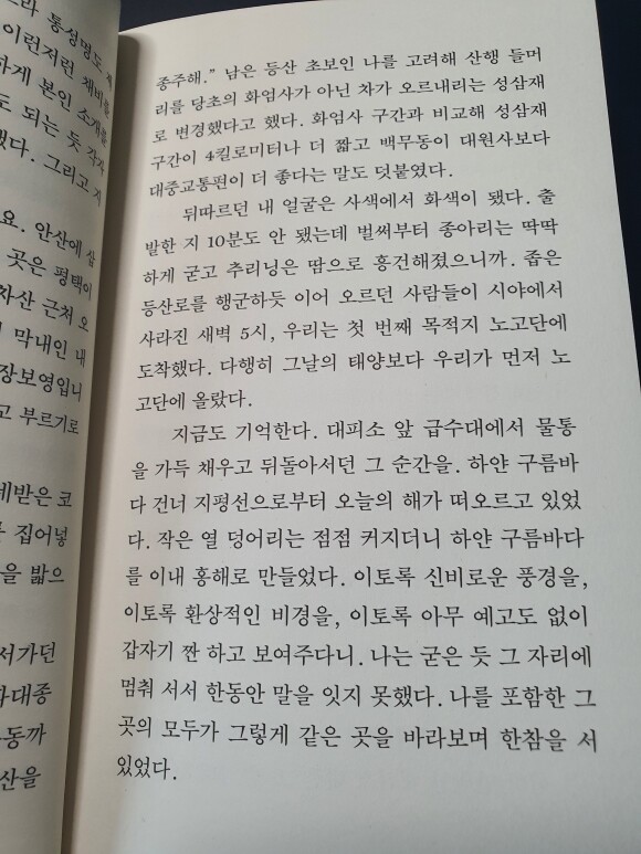작가님은 첫 산이 지리산이었다...세상에! 뭘 몰랐기 때문에 첫 산으로 저렇게 갔을 것이다. 우리 모두에겐 아무것도 몰라서 더 용감했던 시절이 있다. 그리고 그곳에서 만난 일출..... 지리산 종주 이후로 산에 푹 빠져서 주말마다 산을 찾고 히말라야 트래킹을 다녀오고 그 인연으로 <사람과 산>이라는 산악잡지에 입사해서 산과 뗄레야 뗄 수 없는 삶을 살게 된다. 산을 다니며 만난 사람들과 무용담을 더 보고 싶었지만 아쉽게도 이 부분은 아주 담백하게 넘어가 주신다. 산에 다니면 신라시대의 골품제도 처럼 성골, 진골, 육두품처럼 신분이 나뉘는 것을 볼 수 있다. 고등학교 산악부 출신, 대학산악부 출신, ....그런데 작가님은 인터넷 싸이월드 산악클럽 출신이었다...ㅎㅎㅎ 이런 비주류여서 오히려 산에 대해 너무 맹목적이고 대단하게 생각지 않고 좀 더 객관적인 시선일 수 있지 않았을까 싶기도 하다. 요즘 젊은 사람들에게 산은 예전 산악인들만큼의 경외할 만한 대상은 아니기 때문이다.