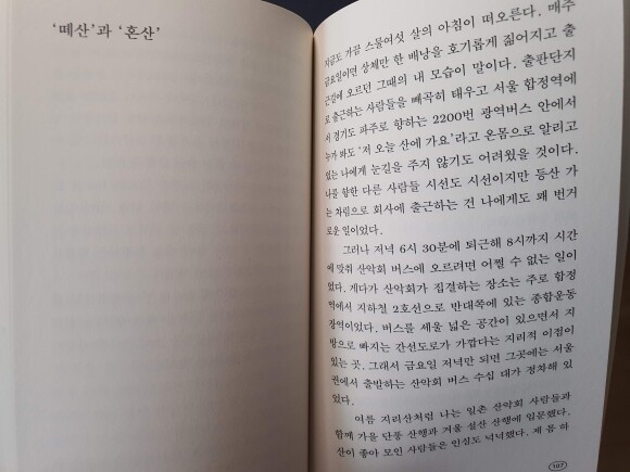 산을 좋아하는 사람과 싫어하는 사람이 있는데 사실 나는 후자이다. 부장님이 산에 가자고 할 때 진심 싫었고 어차피 내려와야 할 곳을 왜 올라가야 하는지 이해를 못했고 남들 올라갈 때 슬쩍 빠져나와서 아래에 있는 회식장소에 앉아서 수다만 떤 적도 있다. 그런 내가 이 책을 왜 샀는지 나도 의문..^^ 아마 산악부였던 절친이 생각나서인 것 같다. 방학때 설악산에 가서 한달동안 텐트치고 지내면서 화장실에서 휴대폰을 충전하고, 대파를 심어서 먹고, 술이 모자라서 산 아래 뛰어내려가서 사오고 의 무용담(요즘은 이런거 안된다)을 들은 나로선 산의 매력이 궁금하기도 했다.