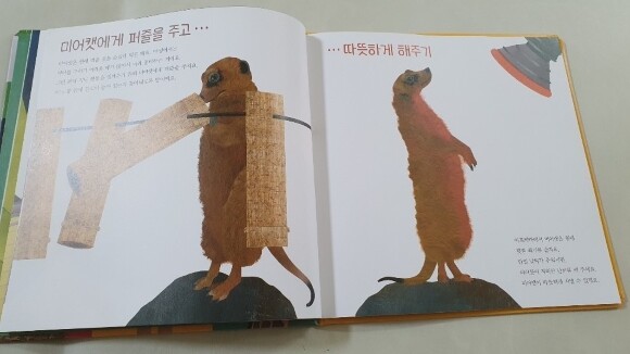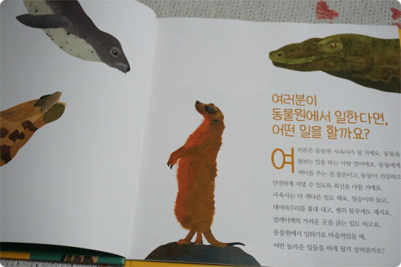 이 책의 표지와 제목만 보았을땐 그저 직업인 사육사에 대해 설명하는구나 했는데, 책장을 한장 한장 넘길때마다 그림으로 사육사는 손이나 도구 쓰는 모습 정도 나오고 동물이 메인으로 나오는 모습을 볼 수 있어요. 각각의 동물들의 환경과 행동, 특징이 나타나는데 동물들마다 독특한 습성과 행동들을 알아야 동물들이 어떤 케어가 필요한 지 알수있겠더라구요. 단순히 먹이주는거에만 그치지 않고 동물에 대해 관심을 갖고 공부하고 이해해야함이 필요한다는 것을 알게 해주네요.