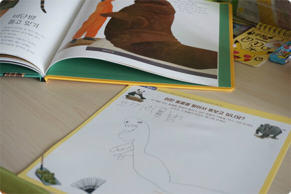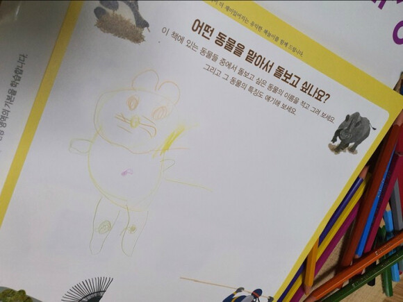 책 사이에 종이 한 장이 부록으로 끼어 있는데요, 어떤 동물을 돌보고 싶은지 독후활동을 해 볼 수 있는 학습지였어요. 우리 아이는 캥거루를 안고 다니고 싶다고 하더라고요. 큰 눈을 따라그리다가 갑자기 지우고 더 아기였을 때는 눈이 작았을 것 같다며 눈을 작게 그리네요. ^^ 동물원에 대해, 또, 동물원 사육사가 하는 일에 대해 자세히 알고 싶은 어린이에게 이 책을 추천합니다. 동물원에서 놀 때 제일 행복했었다고 말하는 우리 아이에게