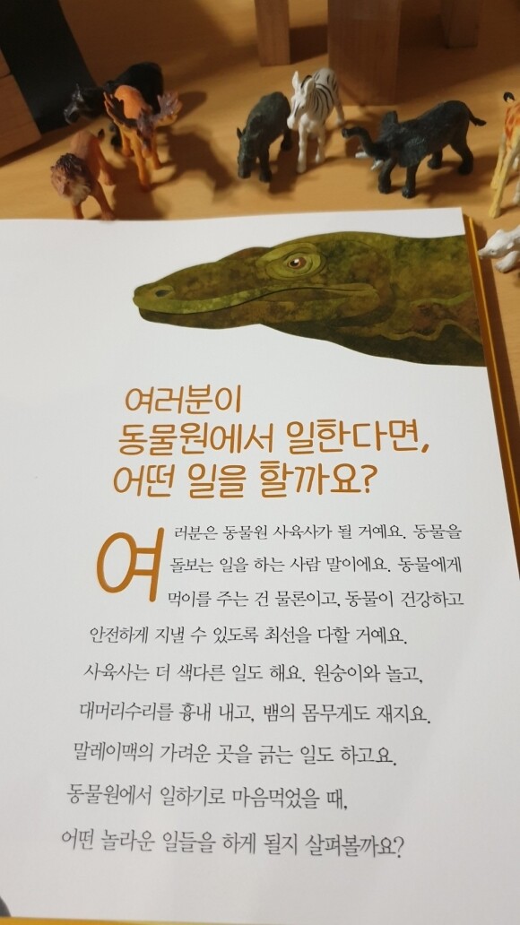 여러분이 동물원에서 일한다면,어떤 일을 할까요? 여러분은 사육사가 돌 거예요. 동물을 돌보는 일을 하는 사람 말이에요. 동물에게 먹이를 주는 겅 물론이고 , 동물이 건강하고 안전하게 지낼 수 있도록 최선을 다할 거예요.