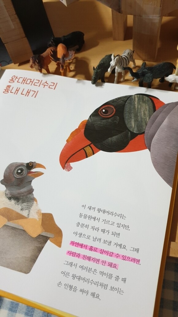 다양한 일들을 하지만 기본적인 보살핌도 있지만 왕대머리수리를 흉내내는 일도 사육사들은 한다. 동물원에서 기르고 있지만 충분히 자라면 야생으로 보내줘야 하는데 그 때 자연에서 홀로 살기 위해 사육사는 사람과 친해지지 않게 하기 위해 먹이를 줄 때 어른 왕대머리수리처럼 보이는 손 인형을 써서 준다. 사람 손에 길러지지만 동물들의 집은 야생이라는 것을 늘 명심하는 요즘 동물원에서는 이렇게 많은 노력들을 하고 있다는 생각에 박수를 보내고 싶다.
