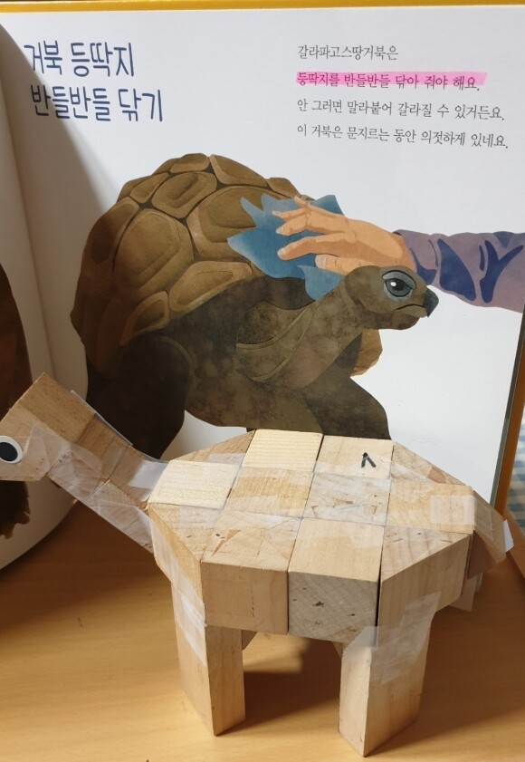 저는 갈라파고스땅거북이를 만들었어요! ㅇ우리가 보았던 거북이라 조금은 달라 보이지 않나요? 다리가 꽤 길지요? 그리고 땅에 사느 거북이 중에 가장 크다고 하네요~~