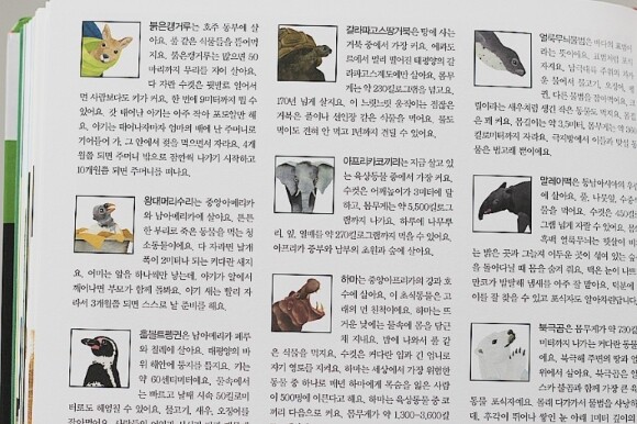 맨 마지막 페이지에는 이 책에 나왔던 동물들에 대한 자세한 설명이 나왔다. 처음 보는 동물들도 있었는데, 아이와 그 동물에 대해 자세히 알아볼 수 있어서 좋았고 단순히 그림으로 끝나는 것이 아닌 이런 지식들을 습득할 수 있는 내용이 있어서 유익하게 느껴졌다.