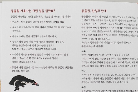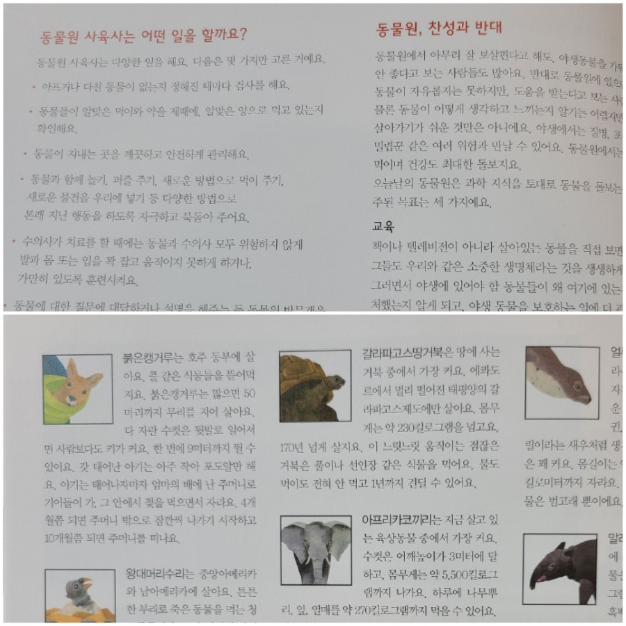 <내가 동물원에서 일한다면?> 책의 끝에는 동물원 사육사들이 하는 일과 동물원에 관해 찬성과 반대 의견들을 소개하고 있다. 아이들이 행복해하지만 동물 입장에서는 자신의 집을 떠나 갇혀 살아가는 거라 참 어떤 것들을 생각하고 챙겨야하는지 끊임없이 생각하게 한다. 그리고 <내가 동물원에서 일한다면?>에서 보았던 동물친구들을 자세하게 설명하고 있다.