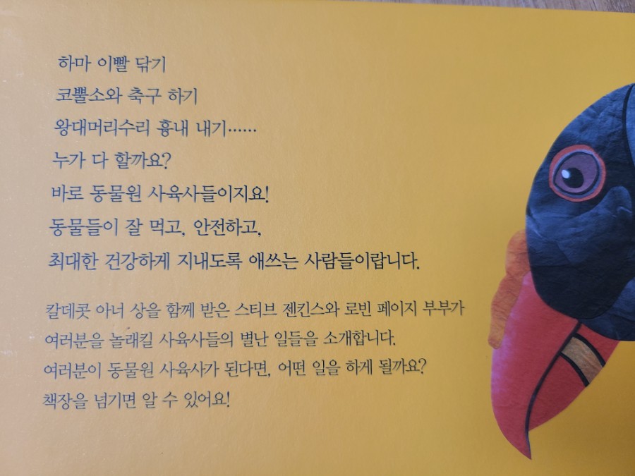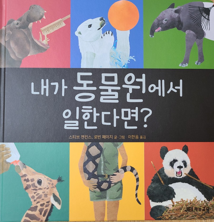 내가 동물원에서 일한다면 (스티브 젠킨스, 로빈 페이지) 책은 예쁘고 큰 그림에다가 자세하지만 간단한 설명이 곁들여 있어서 어린이들도 쉽게 이해할 수 있어요. 이 책을 지으신 스티브 젠킨스와 로빈 페이지 부부는 칼데콧 아너상을 함께 받았다고 하네요. 와우!