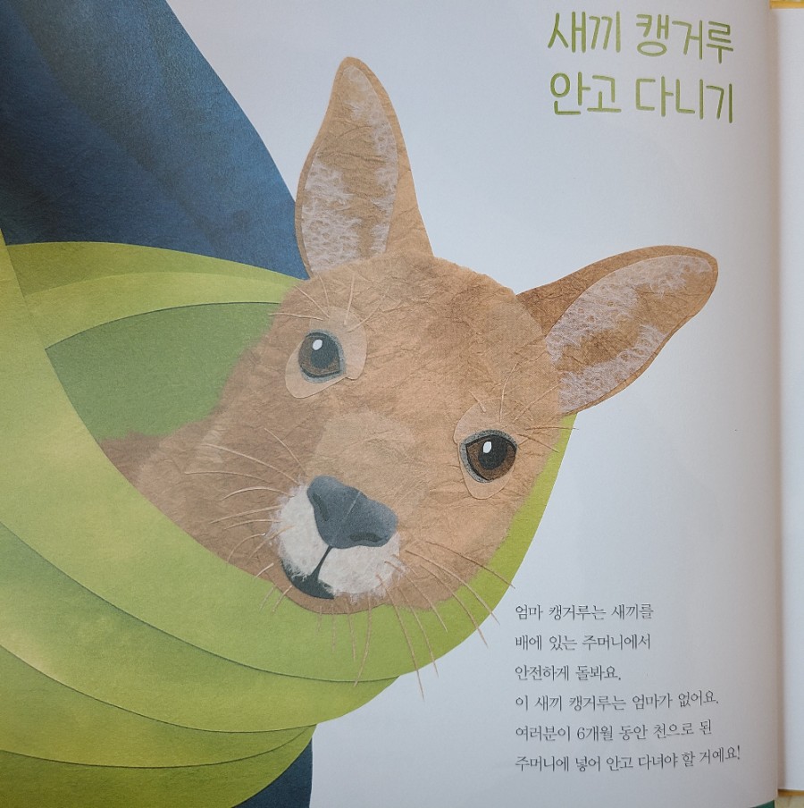 새끼 캥거루 안고 다니기 엄마 캥거루는 새끼를 배에 있는 주머니에서 안전하게 돌봐요. 이 새끼 캥거루는 엄마가 없어요. 여러분은 6개월동안 천으로된 주머니에 넣어 안고 다녀야 할 거에요. 엄마 배에 있는 주머니에서 안전하게 지켜져야할 아기 캥거루. 엄마가 없어 엄마처럼 보살펴주는 노력을 하는 캥거루 사육사. 엄마 배에 있는 주머니와 비슷하게 천으로 만든 주머니에서 생활할 수 있도록 해야하는군요. 아기 캥거루를 사랑하는 사육사의 마음을 알수 있을 것 같아요. 다양한 종이를 자르고 오려그린 아기 캥거루. 마치 한지를 오려기도 하고 보풀이 생기게 해서 아기 캥거루의 복실복실한 털도 나타냈어요. 가늘고 길게 잘라 수염의 섬세함까지~ 다른 동물 친구들도 책에서 만나보세요♡