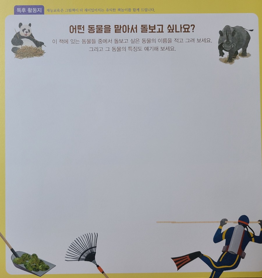 알차게 그림책을 읽고 독후활동을 해볼 수 있었다. 이 책에 나온 동물 중 내가 맡아서 돌보고 싶은 동물 그려보기인데 아이는 이 책에 나오지 않은 '생쥐'를 돌봐보고 싶다며 열심히 그렸다. '쥐'하면 징그럽지만 아이에겐 아직 쥐가 귀여운 존재인가 보다. 생쥐 목욕을 시켜주고 싶다며 열심히 그렸고, '쥐'의 특징에 대해서도 이야기해보았다. 이 책의 뒷부분에도 나온 동물원의 찬성과 반대의 내용처럼 한편으로는 드넓은 자연에서 자유롭게 보내야 행복할 동물들이 동물원에서는 답답하게 우리에 갇혀있는 모습이 안타깝기도하다. 아이에게는 동물원에서 동물을 보는 것이 당연시 되고 있지만 이러한 부분도 언급해줄 필요성이 있지 않을까 싶었다. 예술작품 같은, 아이 방에 걸어두고 싶은 그림 같은 이 책의 그림들을 보는 재미 또한 있었다. 앞으로는 아이와 동물원에 가면 단순히 동물만 보는 것이 아니라 사육사가 보이면 나도 아이도 사육사의 모습도 열심히 보게될 것 같다. 사육사의 모습을 통해서 시각의 영역을 확대시켜준 이 그림책에 고마운 마음이다.