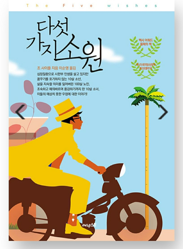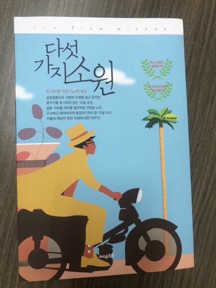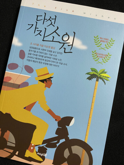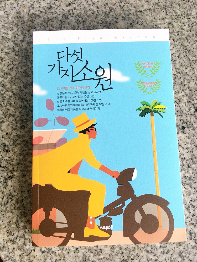 하늘색 표지가 인상 깊은 다섯가지소원이라는 책인데요. 이 이야기는 100살의 노인과 10살짜리 꼬마가 두 주인공이에요. 죽음을 앞두고 있다는 공통점을 가지고 있는데요. 그 공통점을 제외하면 비슷한 점이 하나도 없짐ㄴ, 두 사람의 진심어린 이야기가 펼쳐져요.