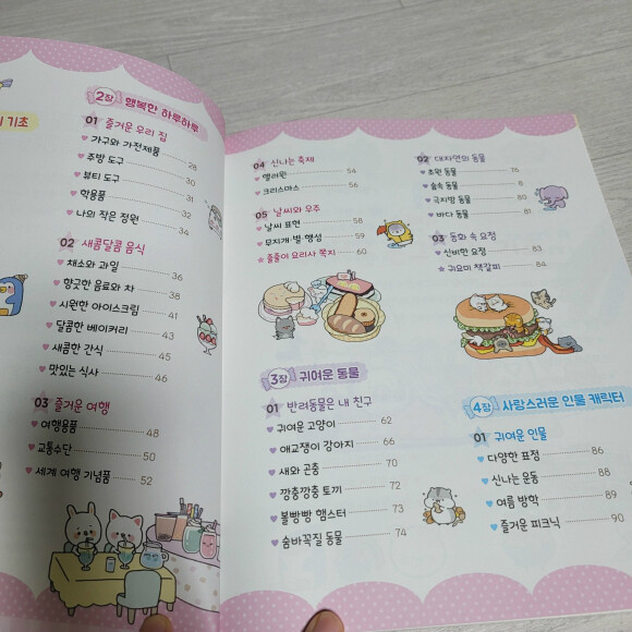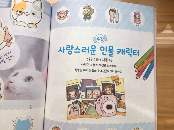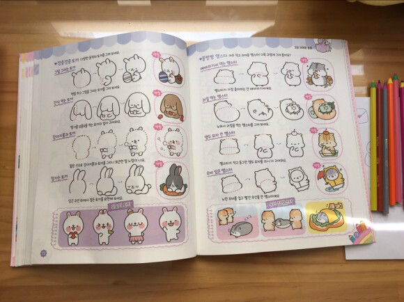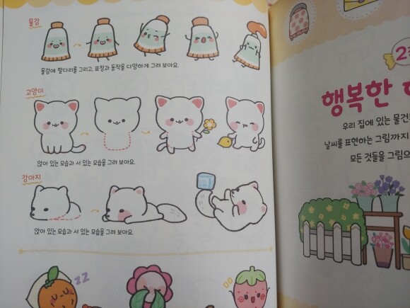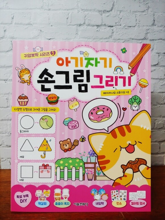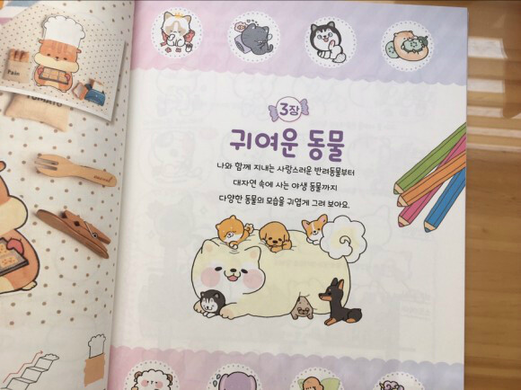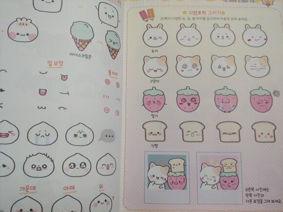 이 책은 <귀엽뽀짝 시리즈 2> 입니다. 시리즈 1 제목이 <인기 유튜버 예뿍이의 작업방>인데 요것도 궁금해지네요. 손그림용으로 나왔지만 다이어리 꾸미기나 손편지 말고도 캐릭터를 이용한 그림 그리기에 유용한 팁이 많아서 좋았습니다. 이모티콘 아이디어를 많이 얻어서 기뻐요~