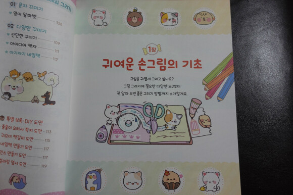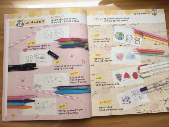 손그림의 기초부터 사물, 음식, 여행, 동물, 인물 까지 그려보고 글자와 프레임 그리는방법 꾸미는 방법 네임텍 에 특별붜록 DIY도안 까지 엄청 야무지게 준비되어 있네요. 그림그리기 도구도 참 다양하죠. 집에 있는 도구들인데 이번 기회에 골고루 사용해 봐야 겠어요.