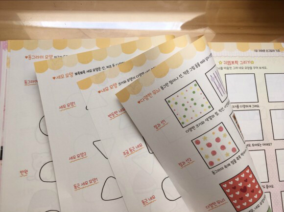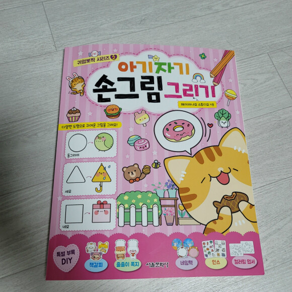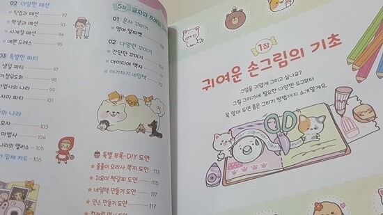 뭐든 꾸미고 만들고 색칠하기를 좋아하는 아이. "귀염뽀짝 시리즈 2. 아기자기 손그림 그리기"는 표지부터 넘 귀염귀염해요. 평소 귀여운 걸 좋아하고, 귀여운 그림, 글씨를 배우고 싶은 분들은 이 책을 강추합니다~ 요즘 집에 있는 시간이 길어진 아이가 수시로 꺼내서 보고 그리고, 만들기를 하면서 시간을 보내고 있어요. 특히, 책 뒤쪽에는 특별 부록으로 책갈피, 쪽지, 네임텍, 인스, 컬러링 엽서 같은 다양한 만들기 부록이 있어서 아이가 정말 좋아했어요~! 책표지를 넘겨보면 1장은 손그림의 기초(그리기 도구 소개, 선과 모양, 귀엽게 그리는 비결)이 나와 있고, 2장~4장에는 여러가지 귀여운 그림들이 나옵니다. 마지막 5장에는 귀여운 글자와 프레임 그리기가 나오고, 특별 부록으로 여러가지 만들기 도안이 들어 있어요.