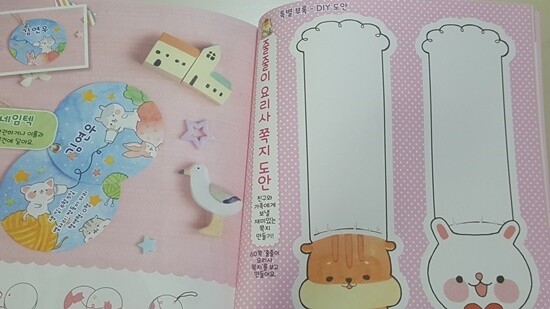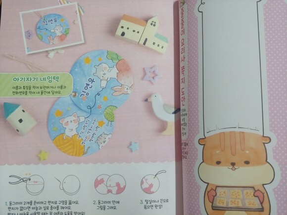 사진을 보고 실제와 비슷하게 그려보고 - 이것을 다시 동그랗고 귀엽게 사랑스러워 보이도록 그리는 법도 있었습니다. 여기서 팁은! 동글동글하고 짤막하게 그리는 것이에요. 얼굴도 다리도 발도 꼬리도요~ 음식, 생활용품, 날씨, 동물, 벌레, 인물 귀엽게 그리는 법과 동화 속 요정도 있었는데요, 이 두 가지를 합쳐서 '왕관을 쓴 고양이'라던가 '안경 쓴 집사 고양이' 같은 느낌으로 책갈피를 만들어보는 방법도 있어서 좋았습니다. 입체카드 만들기가 지나면 글자와 프레임 그리기가 나와요. 손편지 쓸 때 편지지 라인 꾸미기 같은 거요. 전부다 따라 해보고 싶을 만큼 예쁘고 귀여운 그림이에요. 마지막에 나오는 부록도 알찼습니다. (책갈피, 줄줄이 쪽지, 인스, 컬러링 엽서) 이 중에 네임텍이 제일 해보고 싶었는데, 디자인을 고민할 새도 없이 책에 나온 그림이 넘넘 아기자기 졸귀해서 빨리 만들어보려구요.ㅎㅎ