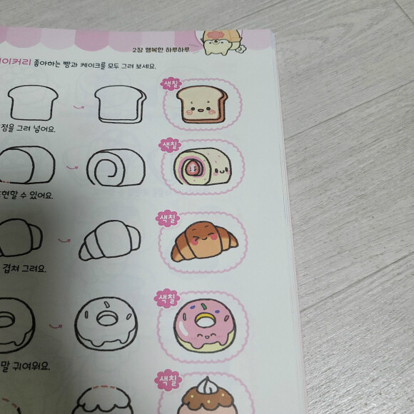 그리고, 페이지 여러 군데에 이렇게 QR코드가 있어서 실제 그리는 모습을 영상으로 볼 수도 있어요. 예뿍이 작가는 식빵 하나도 이렇게 귀여움 넘치게 그리는 재주를 갖고 있네요.