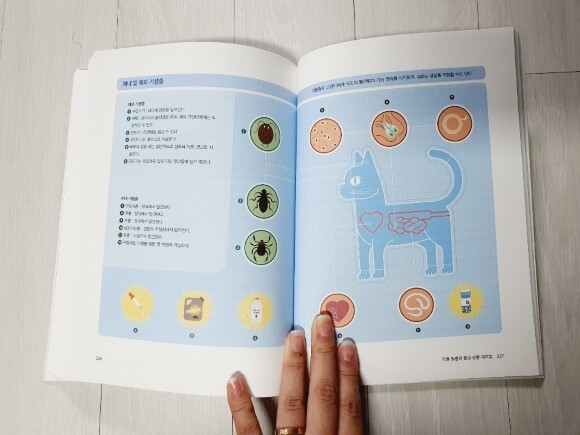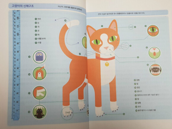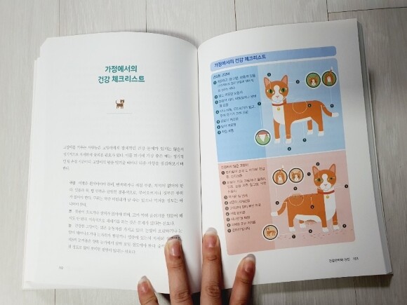 제가 가장 필요로 했던 부분은 후반부에 나오는데요! 가정에서 건강을 체크하는 방법이 그림과 함께 설명되어 있어 이해하기가 더 쉬웠습니다. 그 외에 귀에 약 넣는 방법이나 알약 먹이는 법, 체온 재는 법도 배울 수 있었고 전염성 질병, 만성질환, 기생충, 심리 장애 등도 알아볼 수 있었어요. 중간중간 나오는 '전문가의 팁'을 통해 지역 동물보호소와 손잡고 동물을 입양시켜주는 애완동물 가게가 있다거나 고양이가 깨물고 할퀴어도 가만히 있어야 한다는 등의 내용을 추가로 배워볼 수 있었고, 고양이를 키우는 데 주의해야 할 사항들도 살펴볼 수 있었습니다. 큼직한 글씨체와 컬러풀한 일러스트였어요. 주제별로 정리가 잘 되어 있어서 필요로 하는 부분만 골라서 읽기에 편할 것 같아요. 이번 독서는 고양이에 대해 몰랐던 사실을 새로 알고, 잘못 알고 있었던 부분을 바로 잡을 수 있는 시간이었는데요! 고양이들의 수명은 15~20년이라고 해요. 오랜 친구, 가족이 될 인연이니 집사인 분들, 집사가 될 분들도 이 책을 통해 많이 알아가는 과정을 거치셨으면 합니다~!!