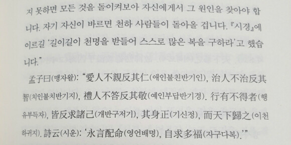 또한 맹자를 이렇게 소개한다. <학문과 심신 수양을 하는 옛사람이나 현대인에게도 훌륭한 지침서가 될 수 있다.> (9쪽)