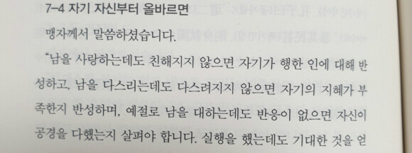 소장가치가 있는 책에 대한 나의 기준은 얼마나 많은 책귀퉁이를 접었는가- 에 있다 이 책도 군자 부분은 어렵거나 나에게 실질적으로 사용하기 어려워 넘겨읽었다면, 인간과 자기 성찰에 대한 부분은 매 페이지마다 책귀퉁이가 접혔을 현실생활에 접할만한 좋은 부분이 있었다.