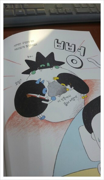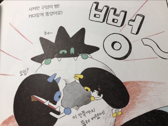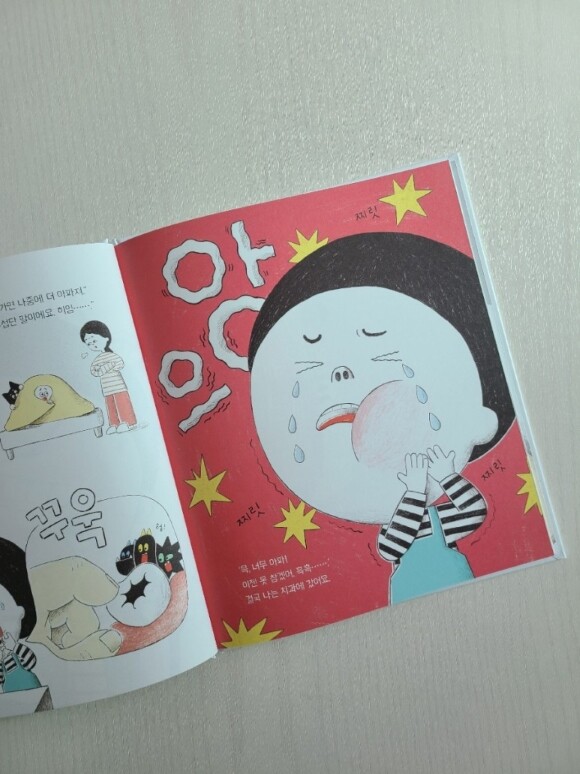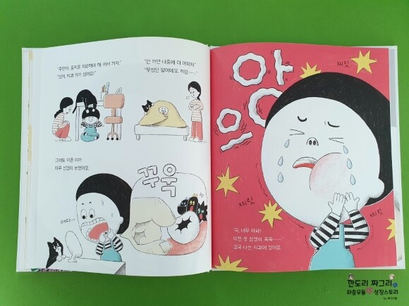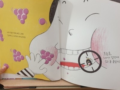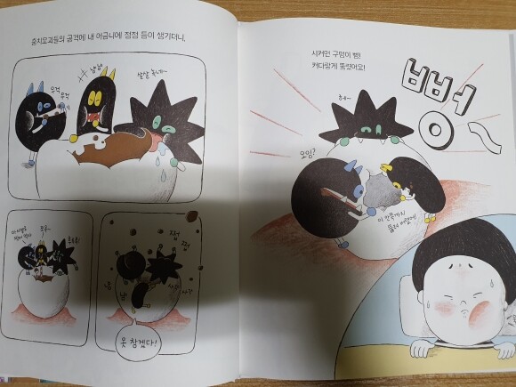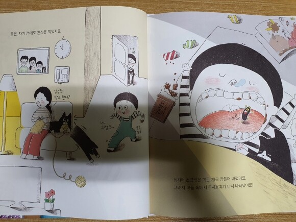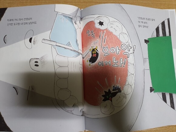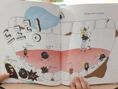 역시 이런 부분이 아이들의 취향을 저격합니다. '충치요괴'가 초콜릿 먹고 잠든 주안이의 입 속을 공격하면서 주안이 이에 낀 음식을 파먹자 어금니가 상하기 시작하더니 뻥 뚫려 버리고 말았어요ㅠㅠ 애들 그림책일 뿐인데 보는 내가 다 아픈 것 같구ㅠㅠㅠ