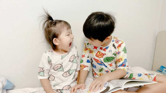 요즘 코로나때문에 집콕육아 중이라, 동생에게 책을 읽어주기도 하는 오빠(토닥토닥)