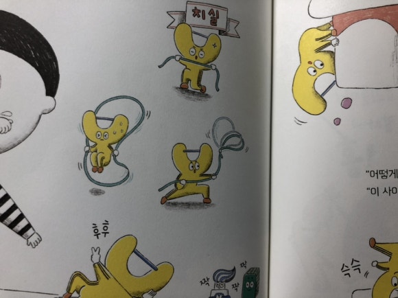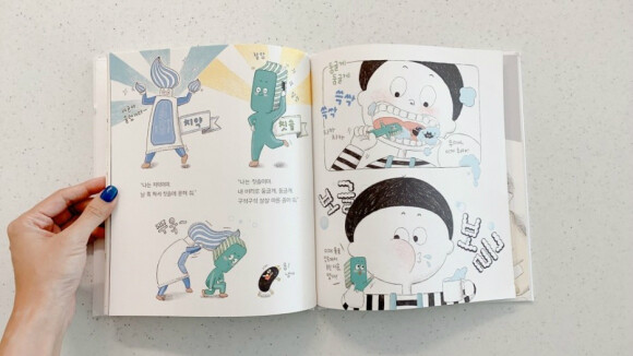 내가 제일 가기 싫은 병원은 치과다. 치과에 들어가면 나는 특유의 냄새와 입을 벌리면 입 속으로 들이닥치는 윙 소리 나는 기구들은 너무 싫다. 어른이 되었고 아이를 낳았지만 산부인과보다 치과가 더 무섭다. 그렇기에 아이와 치과 가는 것도 꺼려져 양치를 중요하게 생각한다. 아직 유치지만 빠질 이라고 해서 썩게 놔두면 절대 안 되기 때문에. 요즘 고래밥이랑 짱구 등 과자 먹는 걸 좋아해서 단 음식을 먹은 뒤엔 이를 더 꼼꼼하게 닦이려고 노력하고 있다. 하지만 아이는 내가 치과에 가기 싫어하는 것 이상으로 양치질을 매우 싫어한다. 뽀로로가 양치하는 영상을 보여주면서 이를 닦아보기도 하고, 강제로 눕혀놓고 팔을 잡으며 울고불고하는 아이에게 억지로 이를 닦이기도 했다. 도무지 마땅한 방법이 생각나지 않는다. 아직 가장 늦게 나는 어금니 4개가 나지 않아서 이가 나려고 양치만 하면 더 아픈가? 라는 생각도 하지만 애초부터 아이는 양치하는 것을 지독하게 싫어했다. 이를 콕콕 찌르는 콕콕벌레를 잡는다는 콘셉트로 어르고 달래는 것도 한계에 다다랐다. 그러던 차에 이 책을 아이에게 보여주었다.