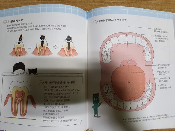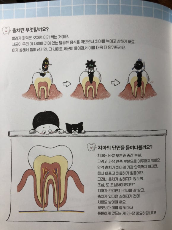 이야기 뒤에는 충치가 무엇인지, 그리고 올바른 양치질과 치아 관리법에 대해서도 아이들의 눈높이로 설명되어 있다.