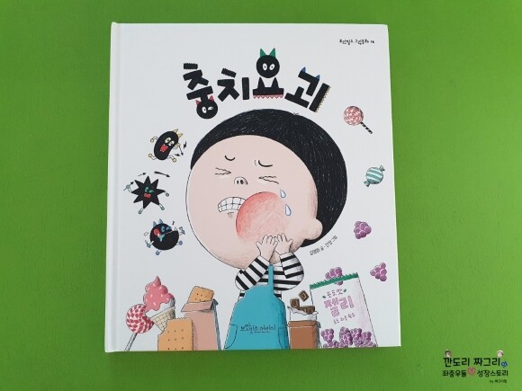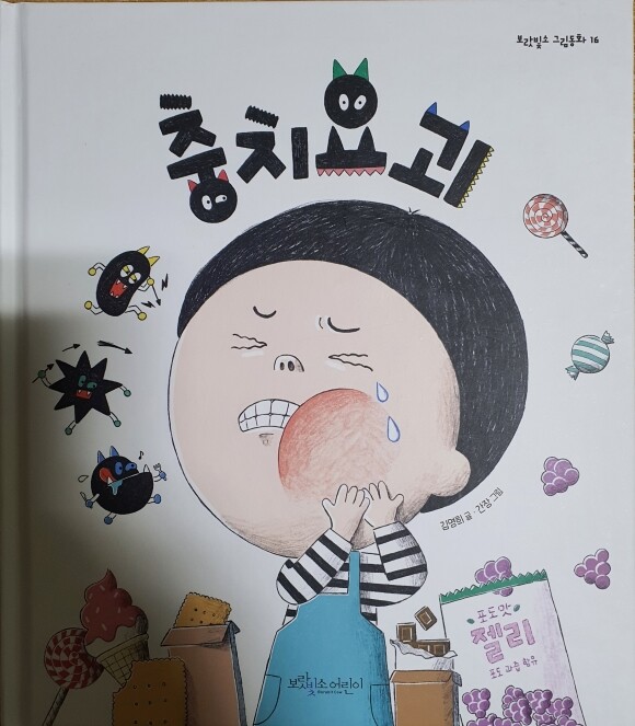 충치요괴 글 김명희 그림 간장 출판 보랏빛소 어린이 요즘 고민이 하나 있어요. 밥을 먹으면 꼭 간식을 챙겨먹어야하는 둘째때문이에요. 정말 간식을 너무너무 좋아해서 하루라도 간식을 먹지 않으면 안되나봐요. 더 큰 문제는 양치를 하는거 싫어한다는거에요!!! 그래서 <충치요괴>를 읽어보고 아이와 이야기 나눠보고 싶었어요!! <충치요괴>는 주인공인 주안이의 치아에 충치가 생기면서 일어나는 일이 그려진 동화에요. 표지에 아이가 정말 아파보이네요. 온갖 간식과 무시무시한 충치에 둘러쌓여 있는 아이, 그런 아이를 보면서 둘째 표정이 심각해지더라구요. 무슨일이 일어났는지 함께 살펴볼까요?!