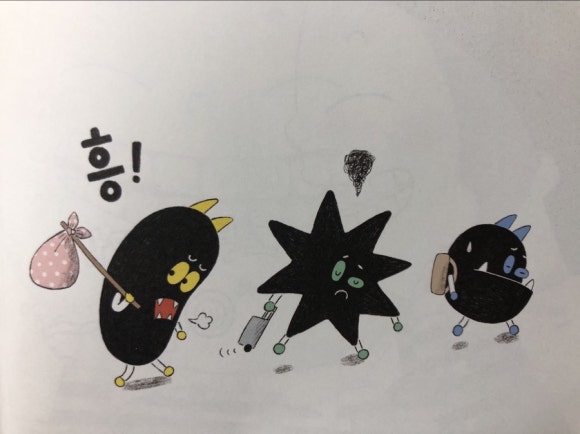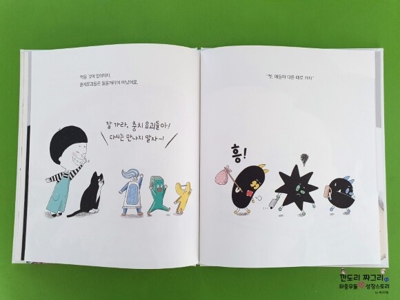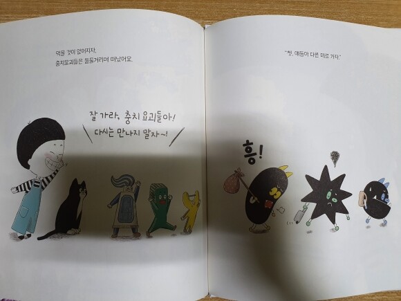 재미있는 표지 그림 덕분인지, 좋아하는 주제인 “요괴”가 등장해서인지, 책을 읽어주기 전부터 둘째가 책을 들고 다니며 책의 이곳저곳을 들춰본다. 둘째가 마음에 드는 책은 내가 읽어 준 것을 흉내 내어 읽거나 혼자 일인다역을 하며 책을 읽는데, 충치요괴가 그 영광의 책이 되었다. 양치물을 뱉을 때 충치요괴들이 함께 나가는 그림에서는 신나하며 주절거린다. “충치 요괴는 먹을 게 없어서 떠났죠.”