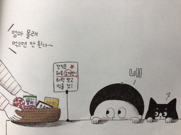 식탁 위에 놓인 간식은 하루 1개만! 허락 받고 먹을 것! 이란 메모가 우리 집 규칙과 거의 똑같다.