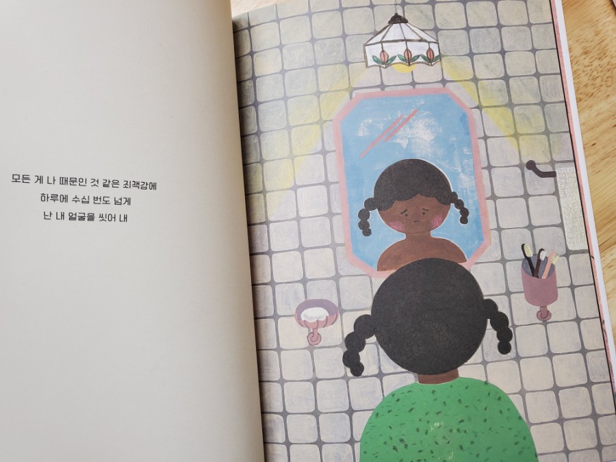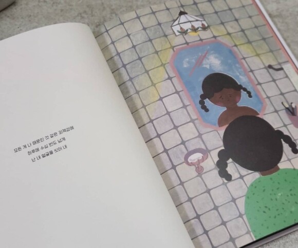 이 책은 우리가 잘 아는 가수 "윤미래"씨의 노래를 바탕으로 만든 책이예요. #윤미래씨의 어린시절을 노래로 그 노래가 다시 그림책으로 탄생하게 된거죠. 복복군이랑은 노래를 먼저 함께 들어 보았어요. 그리고 책으로 다시 한번 보았어요. 유난히 검었던 어린시절의 자신의 모습 하루에도 몇번씩 하얀비누로 자신의 피부를 씻어내는 아이 이 장면에서는 마음이 찡하더라고요 얼마전에 TV프로그램에서 6살 정도 되는 여자아이가 자신의 검은 피부를 감추기 위해서 물감으로 색칠을 했다는 이야기를 듣고 가슴이 턱 막히는 기분이었거든요. 그 모습을 지켜보는 엄마의 마음은 또 어떨까? 아이를 키우고 있는 지금의 나에게도 뭔지 모르게 책임감을 느끼게 하는 장면이었어요. 그래서 복복군과 함께 "검은 행복"의 책을 더 읽고 싶었는지도 모르겠어요.