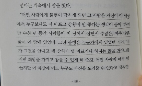 저희집 예비중 소녀에게는 아직 어려운 내용이긴 했지만, 이 책이 가진 희망의 메시지는 이 책을 읽을 청소년들에게 충분히 전해질거라 생각됩니다.