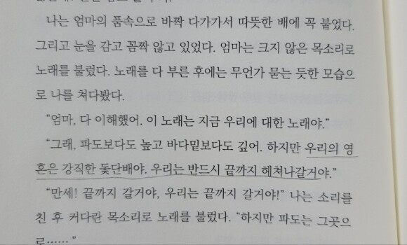 "그래, 파도보다도 높고 바다밑보다도 깊어. 하지만 우리의 영혼은 강직한 돛단배야. 우리는 반드시 끝까지 헤쳐나갈거야." (p.62)
